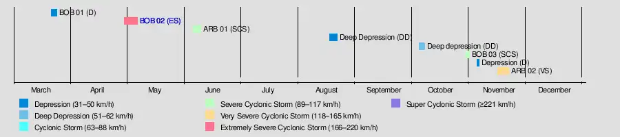 During 1994, the India Meteorological Department (IMD) tracked 8 depressions, less than the average of 15. This included six systems in the Bay of Bengal and two systems over the Arabian Sea. The first system formed on March 21, becoming the first March depression in the Bay of Bengal since 1938. Of the eight depressions, six intensified into a deep depression, which has maximum sustained winds of 50–61 km/h (32–38 mph). Four deep depressions strengthened further into a cyclonic storm, which has sustained winds of at least 65 km/h (40 mph). Two storms during the season became a very severe cyclonic storm, which is the equivalent of hurricane status, with winds of at least 120 km/h (75 mph).[1] During the season, the American-based Joint Typhoon Warning Center (JTWC) issued warnings for five of the tropical cyclones, which is the same as the long term average.[2]