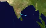 A low-pressure area formed over the western Bay of Bengal on October 28. On the next day, the IMD classified it as a depression, and soon upgraded it to a deep depression. On October 30, the IMD upgraded it further to a cyclonic storm and later a severe cyclonic storm, estimating peak 3–minute winds of 110 km/h (70 mph); this was based on the appearance of a well-defined eye. Also on October 30, the JTWC initiated advisories on the system as Tropical Cyclone 04B north of Sri Lanka. The storm consisted of a consolidating area of thunderstorms, with spiral rainbands. Steered by a ridge to the north, the system moved west-northwestward toward the southeast coast of India. Early on October 31, the storm made landfall in southeastern India near Chennai with winds of 110 km/h (70 mph), according to the IMD, and 85 km/h (55 mph) according to the JTWC. Late on October 31, the storm fell below depression status after weakening over land.[2][1]