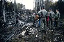 The Alaska Boeing E-3 Sentry accident was the September 22, 1995 crash of a United States Air Force Boeing E-3 Sentry airborne early warning aircraft with the loss of all 24 crewmembers on board.[2] The aircraft, serial number 77-0354 with callsign Yukla 27, hit birds on departure from Elmendorf Air Force Base in Alaska, United States. With the loss of thrust from both of the left engines the aircraft crashed into a wooded area less than a mile from the end of the runway.[1]