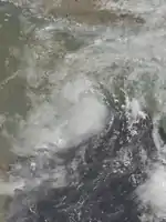 In Bangladesh, the third storm produced a 3 m (10 ft) storm surge and heavy rainfall, reaching 147 mm (5.8 in) over 24 hours in Chittagong.[9] About 100,000 people evacuated their houses to storm shelters due to the floods, while another 100,000 were stranded in their homes due to floods.[10] Many embankment dams were damaged, furthering flooding.[11] On Hatia Island, the storm wrecked over 5,000 homes and 10,000 ha (25,000 acres) of crops,[9] with salt and shrimp farms in the region also destroyed. A 1.8 m (6 ft) storm tide flooded dozens of villages around Cox's Bazar, destroying about 1,000 houses.[10] Two bridges were destroyed, severing traffic between Cox's Bazar and Chittagong. In the latter city, 20,125 houses were damaged or destroyed.[12] Over 60,000 people were left homeless in the country, and there were 60 deaths related to the storm.[2] However, the rains also helped end a damaging five-month drought in the country.[10] The government provided wheat and cash to affected residents to help cope with the disaster.[12] After the storm moved through the area, most freshwater ponds were intruded by saltwater, furthering damage to crops and causing a shortage of drinking water.[11] About 50,000 people became ill after drinking contaminated water, killing around 400 people due to a diarrhea outbreak.[13]