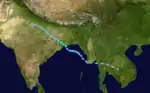 The storm originated from the monsoon trough on November 7 in the Bay of Bengal, east of India. Moving northwestward, the system gradually intensified while moving toward land, eventually developing an eye in the middle of the convection. Reaching peak 3 minute winds of 120 km/h (75 mph), the IMD classified the system as a very severe cyclonic storm, in line with the 130 km/h (80 mph) wind estimate from the JTWC. On November 9, the cyclone made landfall near the border of Andhra Pradesh and Orissa.[2][3] Atypical for most November storms, the system continued to the north and dissipated over Nepal on November 11.[2][16]