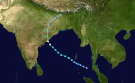 An area of convection blossomed near northern Sumatra on November 18,[3] associated with the monsoon. Aided by the same westerly wind burst that assisted Cyclone Daryl in the Southern Hemisphere, the disturbance gradually organized and persisted while moving west-northwestward through the Bay of Bengal.[3][20] Late on November 21, the system developed into a depression,[2] which the JTWC classified as Tropical Cyclone 04B. Steady intensification ensued; by November 23, the JTWC upgraded the cyclone to the equivalent of a minimal hurricane,[3] and the IMD steadily upgraded the storm to increasing categories.[2] The storm turned to the north and northeast around a ridge, accelerating toward land. At 06:00 UTC on November 24, the JTWC estimated peak 1 minute winds of 195 km/h (120 mph).[3] Shortly thereafter, the IMD estimated peak 3 minute winds of 190 km/h (120 mph), making the system an extremely severe cyclonic storm. By that time, the system had a well-defined eye in the center of deep convection with an eye temperature of -8.7 °C, warmest in North Indian Ocean. Due to increasing wind shear, the storm weakened and made landfall over southeastern Bangladesh with winds of around 120 km/h (75 mph), south of Cox's Bazar around 09:00 UTC on November 25. A few hours later, the system degenerated into a remnant low over northern Myanmar.[2]