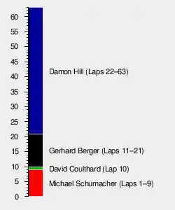 In the midfield the returning Mansell collided with Eddie Irvine in the Jordan and both had to pit. The race ended up being 1992 champion Mansell's last race finish.