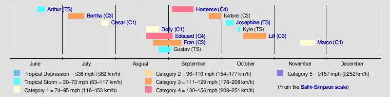 Tropical cyclogenesis in the 1996 Atlantic hurricane season began with the development of Tropical Storm Arthur on June 17. In the month of July, two tropical cyclones formed, both of which later attained hurricane status. August was the most active month of the season, with a total of four storms developing in that period of time. The month of August also featured the strongest and costliest tropical cyclones of the season, Hurricane Edouard and Hurricane Fran, respectively.[8] Although September is the climatological peak of hurricane season,[14] only two tropical cyclones developed in that month. Despite this, both reached major hurricane status. Three tropical cyclones formed in October, with one attaining hurricane status. Finally, one tropical cyclone developed in November, Hurricane Marco. The storm lasted 10 days before dissipating on November 26.[8]