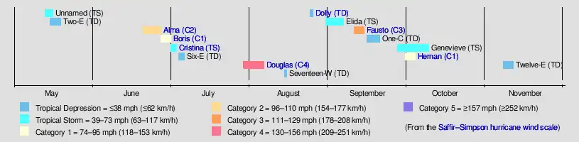 In terms of the number of storms, the season was below average. Despite this, there were a large number of landfalls. Of note is the fact that three tropical cyclones approached close to, or made landfall on, Mexico during a ten-day span from June 23 to July 3.[10] In all, a record-setting four hurricanes (Alma, Boris, Fausto, and Hernan) struck the coastline.[1]