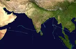 On May 13, a near-equatorial trough developed. The poorly organized system slowly tracked towards the north-northwest. The following day, deep convection consolidated around the center of circulation and the Joint Typhoon Warning Center (JTWC) classified the system as Tropical Cyclone 01B. Favorable upper-level conditions and good outflow allowed the storm to intensify. Shortly after, the cyclone attained tropical storm-force winds and turned towards the northeast. While gradually increasing in forward motion, the storm continued to strengthen. On May 17, the cyclone attained winds of 120 km/h (75 km/h), equivalent to a Category 1 hurricane on the Saffir–Simpson scale. By May 18 an eye developed and the storm reached its peak intensity with winds of 215 km/h (135 mph) before making landfall near Chittagong. After landfall, the storm rapidly tracked northeastward inland and dissipated early on May 20.[1] It caused significant damage and 67 fatalities.[2]