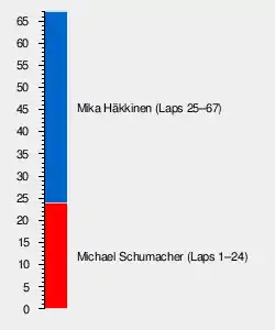 Ferrari locked out the front row with Schumacher on pole ahead of Eddie Irvine. Häkkinen qualified third. At the start Irvine passed Schumacher to take the lead, however he allowed his team leader past at the end of the first lap and then proceeded to hold up Häkkinen. The Finn passed the Ulsterman at the Veedol Chicane on lap 14 and began to close on Schumacher. The German pitted on lap 24, while Häkkinen stayed out until lap 28, emerging from his stop ahead of Schumacher albeit by less than a second. Häkkinen resisted pressure from Schumacher during the second stint and narrowly held on to his lead during the second round of pit stops. In the final stint Häkkinen pulled away from Schumacher, extending his lead to five seconds before easing off in the closing laps to take victory by 2.2 seconds from Schumacher, with the other McLaren of David Coulthard completing the podium having leapfrogged Irvine during the first round of pitstops. The win gave Häkkinen a four-point lead in the championship heading into the final race in Suzuka, meaning he would only need second place there to clinch his first title.