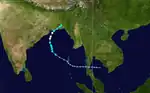 On November 10, an area of low pressure developed over the Bay of Bengal within a monsoonal trough. Moving towards the northwest,[44] the low gradually developed and the JTWC issued a TCFA early on November 13. The next day, the first advisory on Tropical Cyclone 06B was issued.[10] A brief period of rapid development took place as the storm strengthened just below Category 1 status. Shortly before making landfall near Visakhapatnam,[44] 06B reached its peak intensity with winds of 155 km/h (96 mph).[10] At this time, the IMD classified the cyclone as a Very Severe Cyclonic Storm and reported that it had a 60 km (37 mi) wide eye.[45] Rapid weakening followed shortly after landfall and the storm dissipated early on November 16.[10][44]