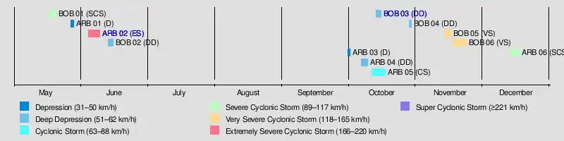 The first storm of the season developed on May 18 out of an area of low pressure over the Bay of Bengal. It reached its peak intensity with winds of 130 km/h (81 mph) before making landfall near Chittagong, Bangladesh. The storm dissipated shortly after.[4] Later that month, a short-lived storm developed over the Arabian Sea and dissipated the next day without impacting land.[5] The most intense storm of the season formed in early June off the southwestern coast of India. It slowly traveled towards the west, remaining relatively weak before turning towards the north and intensifying. The storm reached its peak intensity with winds of 195 km/h (121 mph) shortly before making landfall near Porbandar in the Indian state of Gujarat. The cyclone rapidly dissipated on the same day.[6]