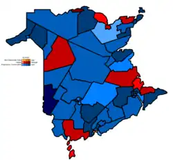 ![]() Map of New Brunswick's ridings coloured in based on the winning parties and their popular vote | |||||||||||||||||||||||||||||||||||||||||||||