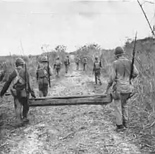 Assigned to the 3rd Marine Division, on 11 March 1943 Col Robert M. Montaque took command of the Regiment in New Zealand.[5] September 1943 saw the regiment land in the Bougainville campaign[6] on that island. The seabees bulldozed paths through the jungle for tanks to attack the Japanese lines. C. Company with other 19th Marines built a corduroy road for tanks and supply movement for the 7th marines. Companies C, F, & I were attached to the 3rd RCT while Companies A, D, & G were attached to the 9th RCT.[7] From there it went to Guadalcanal in preparation for the Battle of Guam (1944). It landed in the assault on Guam with Companies C, F, & I attached to the 3rd Marine Regimental Combat Team, Companies A, D, & G attached to the 9th Marine Regimental Combat Team and Companies B, E, & H attached to the 21st Marine Regimental Combat Team.[7] The regiment was decommissioned on 17 August. The 25th NCB was returned to the Navy and assigned to the 5th Naval Construction Brigade, remaining on Guam until the war ended.[8]