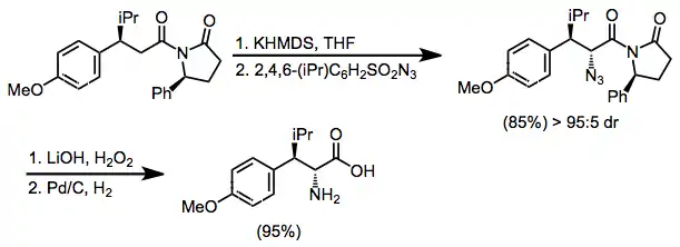 - ↑ Evans, David A.; Britton, Thomas C. (1987). "Electrophilic azide transfer to chiral enolates. A general approach to the asymmetric synthesis of α-amino acids". J. Am. Chem. Soc. 109 (22): 6881–3. doi:10.1021/ja00256a069.