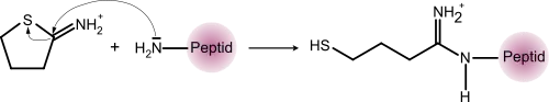 2-Iminothiolane reacts with primary amines efficiently at pH 7 to 9, creating amidine compounds with a sulfhydryl group. Thus it allows for crosslinking or labeling of molecules such as proteins through use of disulfide or thioether conjugation. It was first used to thiolate a subunit of ribosome in E. coli in 1973 by Robert Traut, its namesake, and his colleagues.[2]