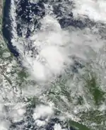 A tropical wave exited the west coast of Africa on May 23 and tracked westward across the Atlantic Ocean and the Caribbean.[12] The system had entered into the Gulf of Mexico on June 6.[16] Another tropical wave merged with the system on June 7 and developed into a low-pressure area in the Gulf of Mexico.[12] Later that day, the National Hurricane Center began classifying the system as Tropical Depression One. Though the depression was predicted to intensify into a tropical storm,[17] strong wind shear produced by an upper-anticyclone prevented significant strengthening.[12]