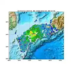 The 2001 Geiyo earthquake (2001年芸予地震 Nisen-ichi-nen Gēyo Jishin) occurred with a moment magnitude of 6.7 on March 24 at 15:27 local time near Hiroshima, Japan. One person in Hiroshima and one person in Ehime were reported dead. About 3,700 buildings were damaged in the Hiroshima area.[2] Liquefaction was observed in Hiroshima[3] and Ehime.[4] Power outages occurred in the prefectures of Hiroshima, Ehime, Okayama, Yamaguchi, and Kōchi. The maximum intensity was shindo lower 6 in Hiroshima.[5] This earthquake could be felt along the eastern and southern coasts of South Korea.[6]