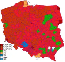 The SLD triumphed in the final tally, receiving 41% percent of the vote, though shy of an outright parliamentary majority in the Sejm.[6] The party increased its representation by 52 seats, earning it 216 representatives, and returned to the Chancellery after a four-year period of sitting in opposition. Partly due to the fractious nature of its opponents, the SLD secured pluralities in all of Poland's voivodeships as well as in an overwhelming majority of the nation's powiats. On the centre right, Civic Platform entered parliament for the first time, coming in second place with nearly 13% of the vote.[6] The party stood relatively strong in Pomeranian Voivodeship.