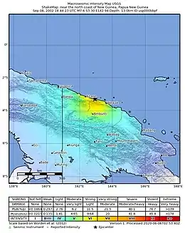 The earthquake was the largest in the Aitape region since 1938.[5] The overall magnitude ranges from 7.2 to 7.7.[3] The United States Geological Survey estimates a magnitude of 7.6. It was caused by a rupture on a low-angle thrust fault in the New Guinea Trench. A fault measuring 72 km in length, and 36 km wide ruptured with a maximum slip of 2.1 meters.[6]