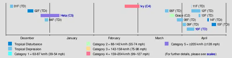 Ivy | February 21 – 28 | Category 4 severe tropical cyclone | 165 km/h (105 mph) | 935 hPa (27.61 inHg) | Vanuatu, Solomon Islands, New Caledonia, New Zealand | $3.8 million | 4 | |