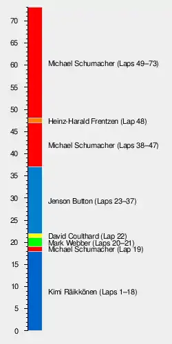 On lap 18, light rain returned to the circuit before intensifying on the next lap.[81] This made cars difficult to drive, and team managers tried to mitigate the effects of the changing conditions by predicting whether the track would remain wet or dry.[90] Alonso, Räikkönen and Michael Schumacher made pit stops to remain on dry-weather tyres over laps 18 to 20. Because of the activity in the pit lane, Webber led the race for two lap, with Button second and Wilson third as the rain continued to get heavier. On lap 21, Button lost control of his car on the wet track, and Wilson moved into second place as drivers began stopping for rain tyres.[81][86] Michael Schumacher, who had proposed switching to rain tyres during his first pit stop,[84] entered the pit lane for intermediate tyres on lap 22.[80] After analysing video footage, the stewards imposed a drive-through penalty on Montoya after deciding that he caused the crash with Barrichello.[82][90][89]