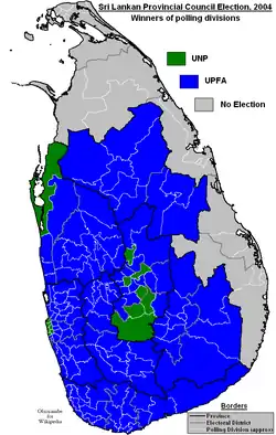 ![]() Winners of polling divisions. UPFA in blue and UNP in green. |