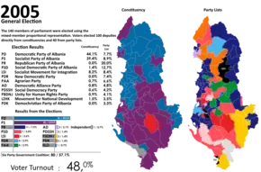 Parliamentary elections were held in Albania on 3 July 2005.[1] The result was a victory for the opposition Democratic Party (PD) and its allies, prominently the Republican Party (PR). Former president Sali Berisha became prime minister as a result of the election.[2]