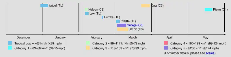 George3 – 10 MarchCategory 5 severe tropical cyclone205 km/h (125 mph)902 hPa (26.64 inHg)Western Australia$15.7 million5
