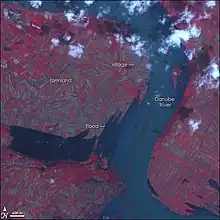 The Danube spills over into farm fields in the northeastern corner of Serbia in this image, taken by the ASTER on NASA's Terra satellite on April 24, 2006.