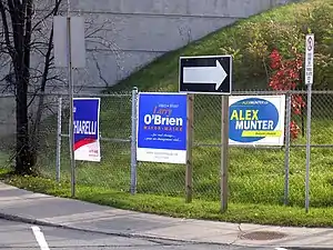 Campaign signs posted at the corner of Metcalfe Street and Catherine Street for leading mayoral candidates Bob Chiarelli, Larry O'Brien and Alex Munter.