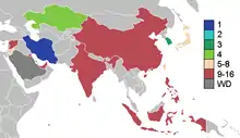 East Asia (2+2+1) | Gulf (2+1) | Middle Asia (2) | Southeast Asia (2) | West Asia (2+2) |