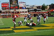 Maryland also played four non-conference games. For the season opener, the Terrapins met the 2007 Division I FCS runners-up, Delaware.[34] California of the Pacific-10 Conference was played for the first time in school history as the first half of a home-and-home series. Athletic director Deborah Yow wanted to play one of the University of Maryland's five academic peer institutions,[35] and to take a two-year hiatus from the 28-year series against West Virginia. She said, by adding California, "We weren't trying to add to the degree of difficulty [of Maryland's schedule]; we were trying to substitute for West Virginia."[36] Games were also played against Middle Tennessee State of the Sun Belt Conference and Eastern Michigan of the Mid-American Conference.[37] For the 2008 Humanitarian Bowl, Maryland played Nevada in the teams' first meeting.
