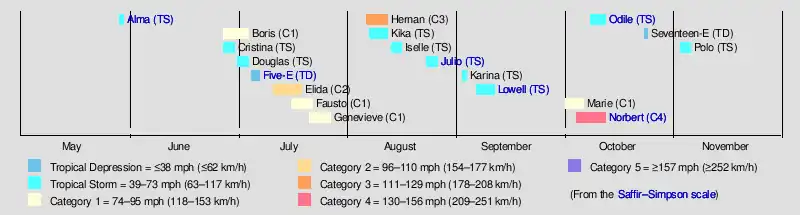 The 2008 Pacific hurricane season was a near-average Pacific hurricane season which featured seventeen named storms, though most were rather weak and short-lived. Only seven hurricanes formed and two major hurricanes. This season was also the first since 1996 to have no cyclones cross into the central Pacific (between 140°W to the International Date Line).[1] The season officially began on May 15 in the eastern Pacific (east of 140°W) and on June 1 in the central Pacific. It ended in both regions on November 30. These dates, adopted by convention, historically describe the period in each year when most tropical cyclone formation occurs in these regions of the Pacific. This season, the first system, Tropical Storm Alma, formed on May 29, and the last, Tropical Storm Polo, dissipated on November 5.