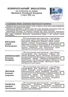 - ↑ (in Russian) О регистрации Дмитрия Анатольевича Медведева кандидатом на должность Президента Российской Федерации Archived 2008-03-05 at the Wayback Machine, Decision No. 88/688-5 of the Central Election Commission of the Russian Federation, January 21, 2008.