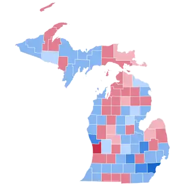 Barack Obama won 46 Michigan counties compared to 37 for John McCain. The largest county with a very close winning margin was a 49.3% vs. 48.8% plurality for Obama in Kent County.[22] As of the 2020 presidential election, this is the last presidential election in which Alger County, Alpena County, Arenac County, Benzie County, Berrien County, Cass County, Clare County, Clinton County, Delta County, Gladwin County, Gratiot County, Iosco County, Iron County, Jackson County, Lenawee County, Mason County, Menominee County, Oceana County, Ogemaw County, Ontonagon County, Presque Isle County, Roscommon County, Schoolcraft County, and St. Clair County voted for the Democratic candidate. This is also the last presidential election in which the Democratic candidate won the Upper Peninsula.