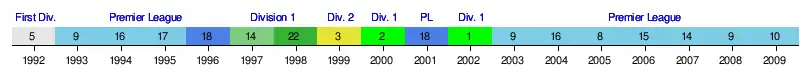 Prior to this season, the history of Manchester City's performance in the English football league hierarchy since the creation of the Premier League in 1992 is summarised by the following timeline chart – which commences with the last season (1991–92) of the old Football League First Division (from which the Premier League was formed).