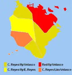 ![]() The colors indicate municipalities where a candidate gathered the majority of votes(governor/vice-governor/congressman): Dirty Yellow for Carmencita Reyes / Antonio Uy / Allan Velasco, Yellow for Carmencita Reyes / Antonio Uy / Edmundo Reyes, Orange for Carmencita Reyes / Jasper Lim / Allan Velasco and Red for Wilfredo Red / Antonio Uy / Allan Velasco. Incumbent Jose Antonio Carrion, Narciso Daquioag and incumbent vice-governor Tomas Pizarro was unable to secure a majority in any of the municipalities. | ||||||||||||||||||||