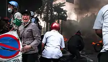 Ratchaprasong was surrounded with armoured vehicles and snipers in the days leading to 13 May.[15] On the evening of 13 May, Khattiya Sawasdiphol ("Seh Daeng"), a popular security adviser to the protesters, was shot in the head by a sniper's bullet while he was giving an interview to The New York Times. The state of emergency, already in place in Bangkok, was expanded to 17 provinces and the military commended an extended crackdown, leading to an additional 41 civilian deaths (including an Italian photographer) and more than 250 injuries by 8:30 pm on 18 May.[16] One military death occurred due to friendly fire.[17] The military claimed that all civilians killed were either armed terrorists or civilians shot by terrorists, and noted that some civilians were shot by terrorists disguised in army uniforms.[18] The military declared the area a "live fire zone," and medics were banned from entering.[4][19][20][21] On 16 May, UDD leaders said they were ready for talks as long as the military pulled back, but the government demanded the protesters' unconditional dispersal.[22] The government rejected a Senate call for a ceasefire and Senate-mediated negotiations. On 17 May, Amnesty International called for the military to stop using live ammunition.[23] Armored vehicles led the final assault into Ratchaprasong in the early morning of 19 May, killing at least five.[24] Soldiers were reported to have fired on medical staff who went to the aid of shooting victims.[24] By 1:30 pm, UDD leaders surrendered to police and told protesters to disperse. Dozens of arson attacks broke out nationwide. A curfew was declared and troops were authorized to shoot on sight anybody inciting unrest.[24]