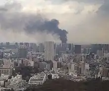 The main earthquake was preceded by a number of large foreshocks, with hundreds of aftershocks reported. One of the first major foreshocks was a 7.2 Mw event on 9 March, approximately 40 km (25 mi) from the epicenter of the 11 March earthquake, with another three on the same day in excess of 6.0 Mw.[7][58] Following the main earthquake on 11 March, a 7.4 Mw aftershock was reported at 15:08 JST (6:06 UTC), succeeded by a 7.9 Mw at 15:15 JST (6:16 UTC) and a 7.7 Mw at 15:26 JST (6:26 UTC).[59] Over eight hundred aftershocks of magnitude 4.5 Mw or greater have occurred since the initial quake,[60] including one on 26 October 2013 (local time) of magnitude 7.1 Mw.[61] Aftershocks follow Omori's law, which states that the rate of aftershocks declines with the reciprocal of the time since the main quake. The aftershocks will thus taper off in time, but could continue for years.[62]