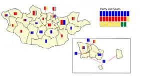Mongolian People's Party | 353,839 | 29.53 | 16 | 9 | 25 | –20 | ||