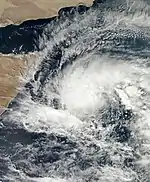 On October 23, the IMD reported that a depression had developed out of an area of low pressure about 800 km (495 mi) to the west of India's Amindivi Islands.[9] The storm then tracked westwards and intensified into a deep depression by 18:00 UTC on the same day, followed by a Tropical Cyclone Formation Alert issued by the Joint Typhoon Warning Center at 20:00 UTC.[10] Late on October 24, the IMD upgraded depression ARB 01 to a cyclonic storm, officially naming it Murjan. Murjan became the first cyclonic storm of the season.[11] The cyclone continued tracking westward at 14 knots (26 km/h; 16 mph). Microwave satellite imagery depicted that most of the convection remained to the south of the system. At that time, Murjan was tracking just south of a subtropical ridge in an environment with low vertical wind shear.[12] The storm crossed the coast of Somalia by late 25 October and gradually weakened into a depression.[13] The India Meteorological Department issued their final bulletin for Murjan at 06:00 UTC of 26 October 2012.[14]
