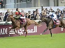 ![]() Solemia (right) passing Orfevre (left) as they are about to pass the goal | |