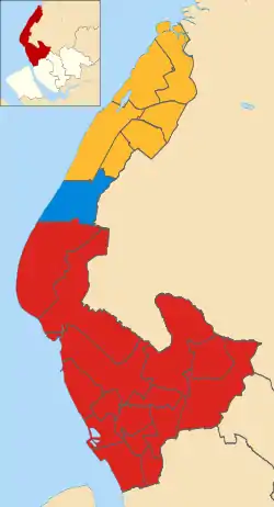 The election resulted in a landslide for the Labour Party, which won 48% of the popular vote and 15 of the seats up for election - more than double the seven it went into the election with. Labour won a clean sweep in the southern constituencies of Sefton Central and Bootle. This brought the total number of seats controlled by Labour on the Council up to 36 giving the party an overall majority of six. As a result, the Sefton Labour Group formed a majority administration for the first time since the Council's creation in 1973.[2] Although the party failed to make a breakthrough in the northern town of Southport, it did win more than 20% of the popular vote there, a feat it has not achieved at a general election since 1966. The party also out-polled Conservative Party in three of Southport's seven wards and out-polled a sitting Councillor (in Duke's Ward) for the first time in years.
