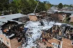 ![]() The Mayfair Mews apartment complex after the crash, the tail section of the F/A-18D still at the site (center) | |