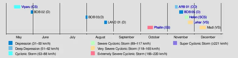 This is a table of all storms in the 2013 North Indian Ocean cyclone season. It mentions all of the season's storms and their names, durations, peak intensities (according to the IMD storm scale), landfall(s) – denoted by bold location names – damages, and death totals. Damage and death totals include the damage and deaths caused when that storm was a precursor wave or extratropical low, and all of the damage figures are in 2013 USD.