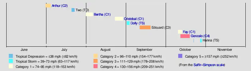Tropical cyclogenesis began in early July, with the development of Hurricane Arthur on July 1, ahead of the long-term climatological average of July 9. Early on July 3, the system intensified into a hurricane, preceding the climatological average of August 10.[24] Later that month, a tropical depression developed over the eastern Atlantic, but dissipated after only two days. There were also two tropical cyclones in August, with the development of hurricanes Bertha and Cristobal. Despite being the climatological peak of hurricane season, only two additional systems originated in September – Tropical Storm Dolly and Hurricane Edouard. In October, three storms developed, including hurricane Fay and Gonzalo and Tropical Storm Hanna.[25] The most intense tropical cyclone – Hurricane Gonzalo – peaked with maximum sustained winds of 145 mph (235 km/h) on October 16 which is a Category 4 on the Saffir–Simpson hurricane wind scale. It was the first Category 4 hurricane since Hurricane Ophelia in 2011.[26] The final tropical cyclone of the season was Hanna, which dissipated on October 28.[25]