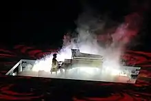 The closing ceremonies began with a countdown to the sounds of the 9th Movement of Pictures at an Exhibition by Modest Mussorgsky, at the conclusion of which the LED forest turned on.[3] Lyubov, the girl from the opening ceremony, entered the stadium in a rowing boat with two clowns and two children named Yuri and Valentina. An image representing the Black Sea below appeared on the floor. Many volunteers appeared below them dressed as sea fish, which first form the Taegeuk symbol (a nod to Pyeongchang, the next winter Games host city), the infinity symbol and a star, then combined to form four Olympic Rings and a dot, a reference to the malfunction of one of the rings at the Opening Ceremony failing to open properly. After a pause, the volunteers forming the dot "opened" into the fifth Ring.[4] The Russian flag was carried by the Russian Olympic Champions from the games.