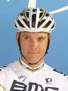 In 2014, Samuel Sánchez (then BMC Racing Team) had attacked at the foot of the Cauberg on behalf of his teammate Philippe Gilbert, whose subsequent attack allowed him to take the race victory. They attempted to replicate this strategy with an attack from Ben Hermans in the same place as Sánchez. Gilbert's attack, however, was less successful than his 2014 effort: although most riders were dropped, Michael Matthews was able to hold his wheel. Michał Kwiatkowski was chasing alone at this point. Valverde bridged across to Gilbert and Matthews, with another 15 riders joining the group shortly afterwards. Kwiatkowski was a long way behind with 500 metres (1,600 ft) remaining, but was able to stay in the slipstream of the other riders and recover from the climb. He then began a long sprint and was able to keep the rest of the group behind him. Valverde finished second, with Matthews third. Kwiatkowski's win was his first win in the rainbow jersey of the world champion.[15][16]