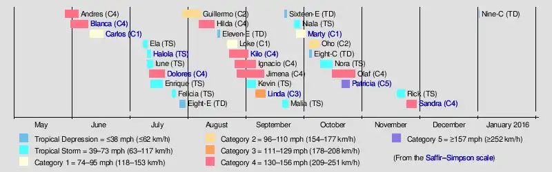 Hurricane Sandra (2015)Hurricane PatriciaHurricane Marty (2015)Hurricane Linda (2015)Hurricane KiloHurricane Dolores (2015)Typhoon HalolaHurricane Carlos (2015)Hurricane Blanca (2015)Saffir–Simpson scale