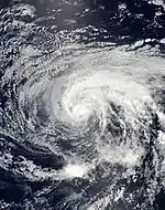 September saw the formation of five systems, excluding Kevin which was named in September but formed on August 31.[24][25] Three systems—Linda, Sixteen-E, and Marty—affected Mexico, with the first two also bringing floods to the Southwestern United States.[26][27][28] The flood event caused by Linda in Utah was also the state's deadliest.[26] October saw another five systems.[29][30] With the formation of Oho on October 3, the 2015 season surpassed 1992 and 1994 as the most active year on record in the Central Pacific.[31] During October 18–19, Olaf became the southernmost-forming hurricane and major hurricane in the Eastern Pacific.[32][33] Olaf later became the first system on record to cross from the Eastern Pacific into the Central Pacific and then back into the Eastern Pacific while still a tropical cyclone.[34] Patricia became the strongest hurricane in the basin on October 23 when its pressure fell to 892 mbar (hPa; 26.34 inHg), breaking the previous record of 902 mbar (hPa; 26.64 inHg) set by 1997's Hurricane Linda.[35] Patricia subsequently became the strongest tropical cyclone on record in the Western Hemisphere in terms of barometric pressure, with a central pressure of 872 mbar (hPa; 25.75 inHg). This value was also the second-lowest globally, behind Typhoon Tip of 1979 which had a central pressure of 870 mbar (hPa; 25.69 inHg). Additionally, its maximum sustained winds of 215 mph (345 km/h) were the strongest ever reliably recorded or estimated anywhere globally.[36] Patricia later became the strongest Pacific hurricane to strike Mexico after making landfall in Jalisco as a strong Category 4 hurricane.[36]