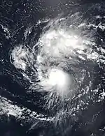 A weak low-pressure area was first identified in the monsoon trough southeast of Hawaii on July 2. It drifted west-northwest, gradually becoming better defined as thunderstorm activity increased and it separated from the monsoon trough; by 06:00 UTC on July 10, there was sufficient organization to declare it a tropical depression. The small size of the cyclone made it especially susceptible to moderate upper-level winds, and it failed to intensify to Tropical Storm Iune until 18:00 UTC on July 11, when deep convection persisted near the center. No further intensification occurred amid light southerly wind shear, and Iune weakened to a tropical depression around 18:00 UTC on July 12 as it moved west-southwest. After being devoid of thunderstorm activity for 18 hours, the storm degenerated to a remnant low by 12:00 UTC the next day. The post-tropical cyclone moved west across the Central Pacific before finally dissipating around 12:00 UTC on July 17.[77]