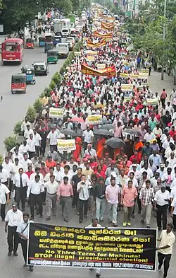 The incumbent Mahinda Rajapaksa ran as the UPFA candidate, seeking an unprecedented third term.[71][72] He also received the backing of a number of small constituent parties of the UPFA including the Ceylon Workers' Congress,[73] Communist Party,[74] Lanka Sama Samaja Party (LSSP),[75] National Freedom Front,[76] National Union of Workers[77] and the Up-Country People's Front.[78] On nomination day, 8 December 2014, two opposition MPs, Tissa Attanayake and Jayantha Ketagoda, defected to the government to support Rajapaksa.[79][80] Attanayake was later appointed Minister of Health — the post previously held by Sirisena.[81][82] Rajapaksa had also received the support of Buddhist extremist Bodu Bala Sena.[83]